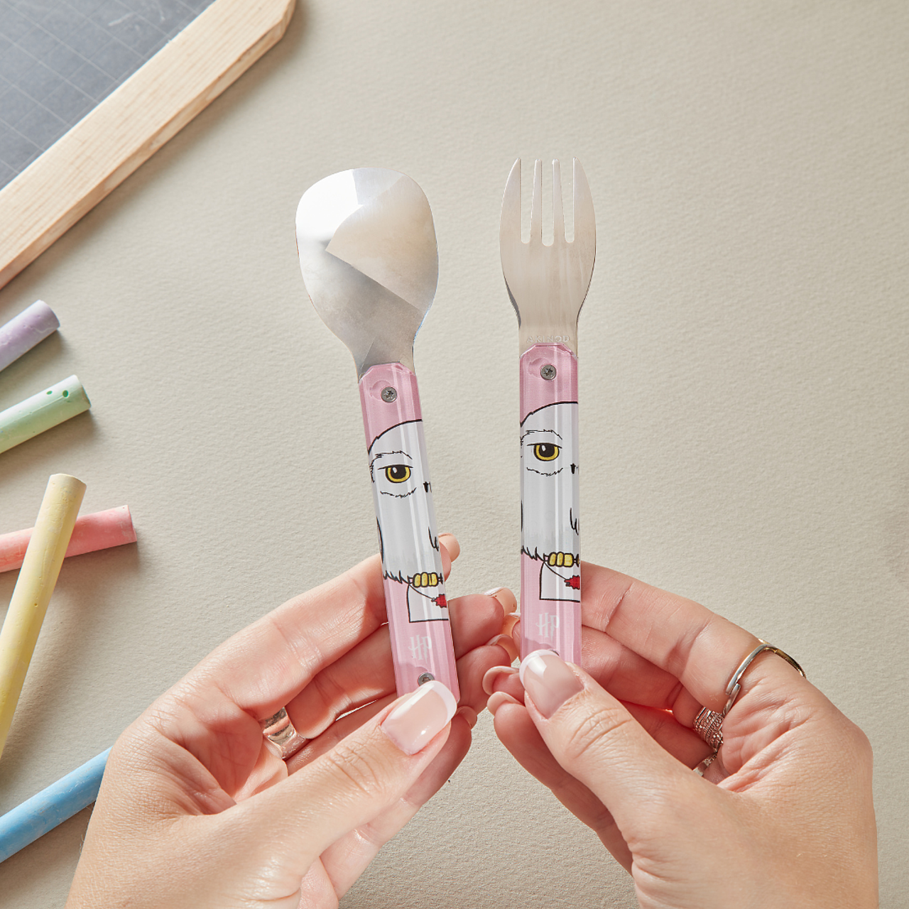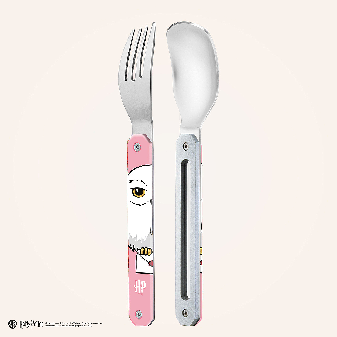 Posate in acciaio inossidabile martensitico 2CR14 con finitura lucida a specchio. Composte da un cucchiaio e una forchetta a 4 rebbi. Manico decorato in polimero trasparente (PC). Montaggio magnetico. Fornite con custodia rigida in polipropilene (PP). Lavabili in lavastoviglie.