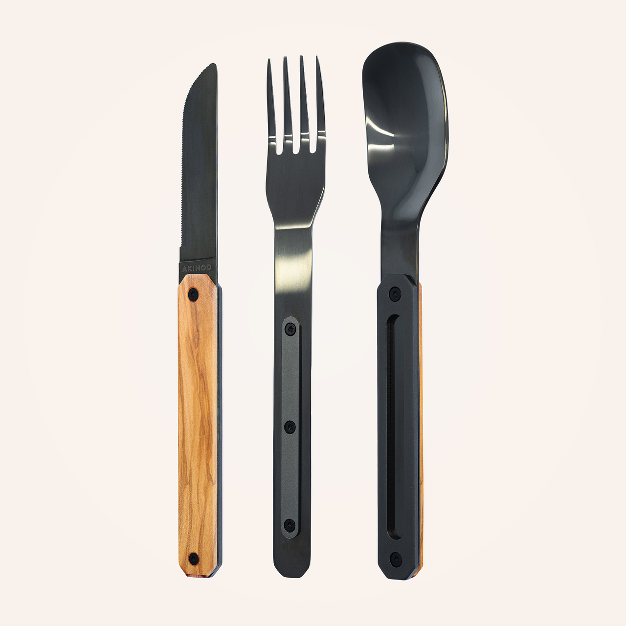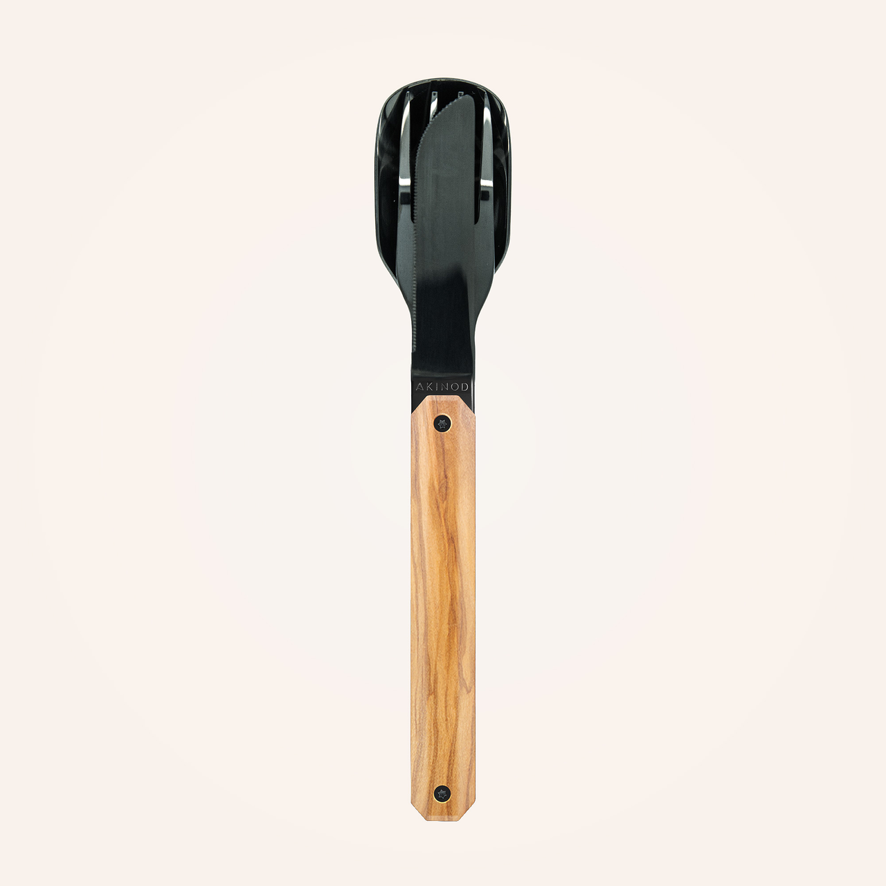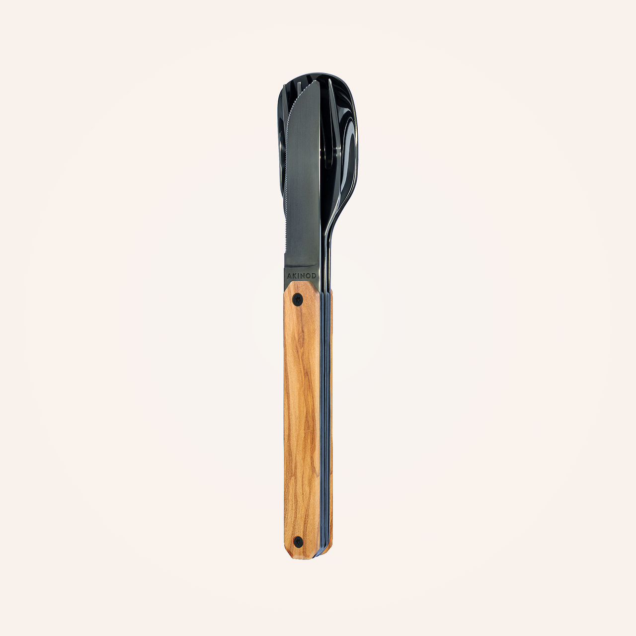 Posate in acciaio inossidabile martensitico 2CR14, finitura nera lucida a specchio. Composto da un cucchiaio grande, una forchetta a 4 denti e un coltello con lama microseghettata. Manico in olivo. Assemblaggio magnetico. Viene fornito con custodia rigida in polipropilene (PP).