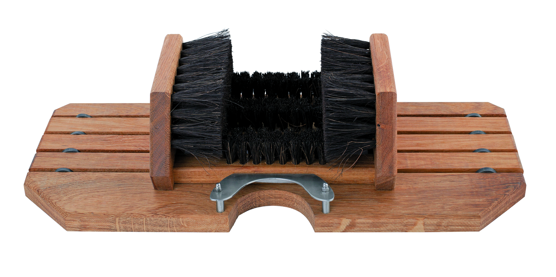 Pulisci scarpe/zerbino con togli stivale in acciaio inox integrato, in legno di quercia e arenga. Dimensioni: 52 x 21 cm.