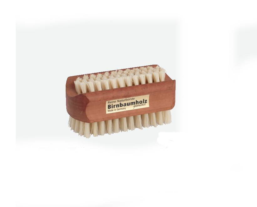 Spazzola per unghie ovale in legno di pero e setole chiare, con setole su due lati. Dimensioni: 9,5 x 5 cm.
