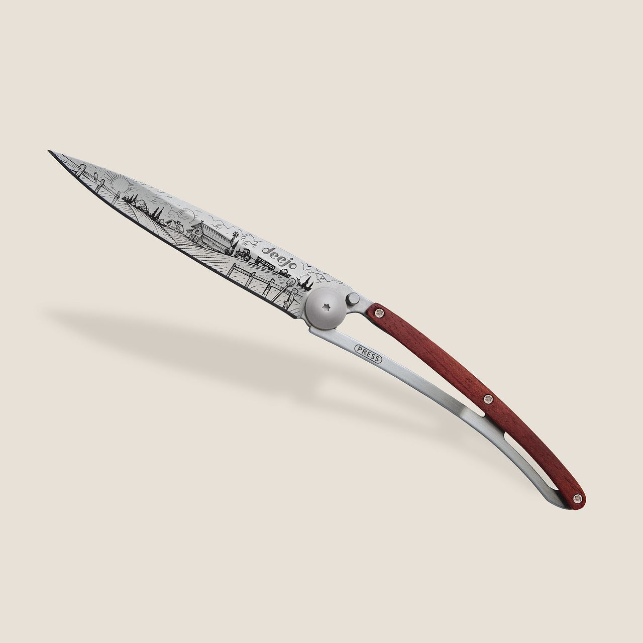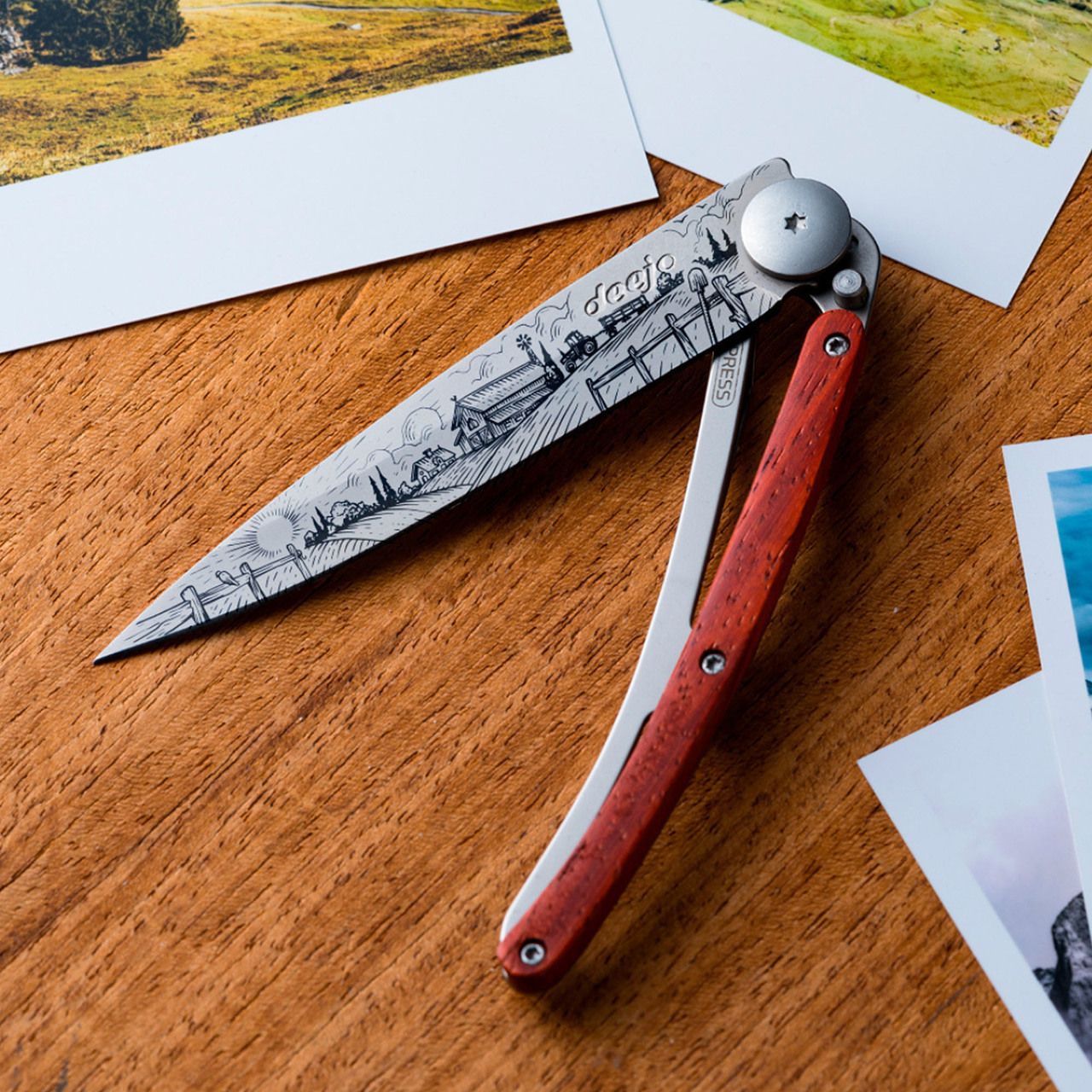 Questo coltello Deejo è decorato con una piastra in legno massello di corallo (o Padouk). Questo tipo di legno è da tempo utilizzato nelle posate per i suoi preziosi riflessi rosso/ambra (da cui il nome), la sua robustezza e l'ottima resistenza all'umidità. Qui mette meravigliosamente in risalto l'eleganza di un coltello Deejo.