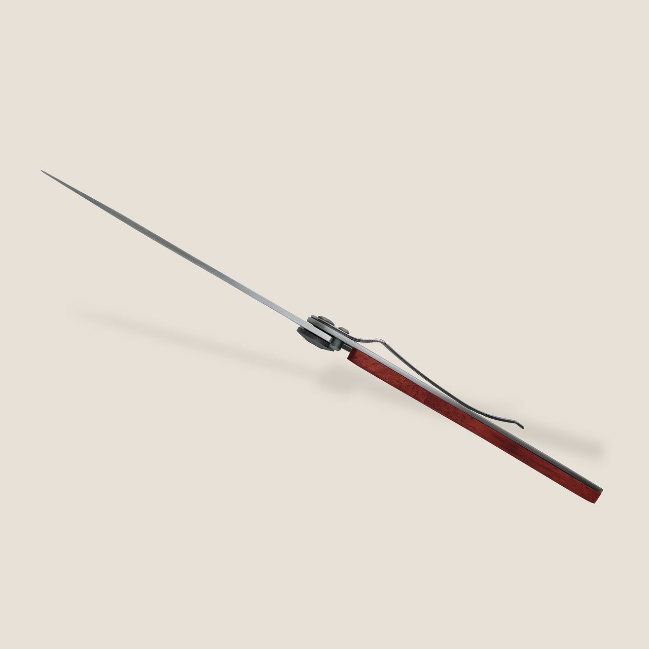 Coltello ultraleggero in acciaio inox Z40C13, finitura grigio titanio. Lama con fermo di sicurezza tipo 'liner lock' decorato con fine incisione laser. Clip per cintura. Manico in legno di corallo.