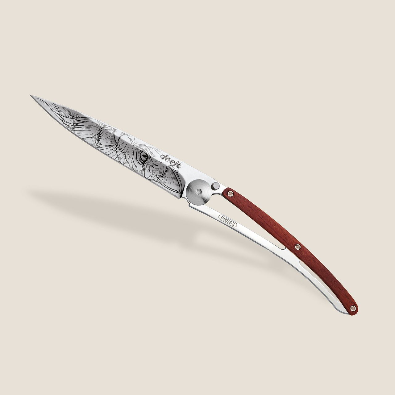 Questo coltello Deejo è decorato con una piastra in legno massello di corallo (o Padouk). Questo tipo di legno è da tempo utilizzato nelle posate per i suoi preziosi riflessi rosso/ambra (da cui il nome), la sua robustezza e l'ottima resistenza all'umidità. Qui mette meravigliosamente in risalto l'eleganza di un coltello Deejo.