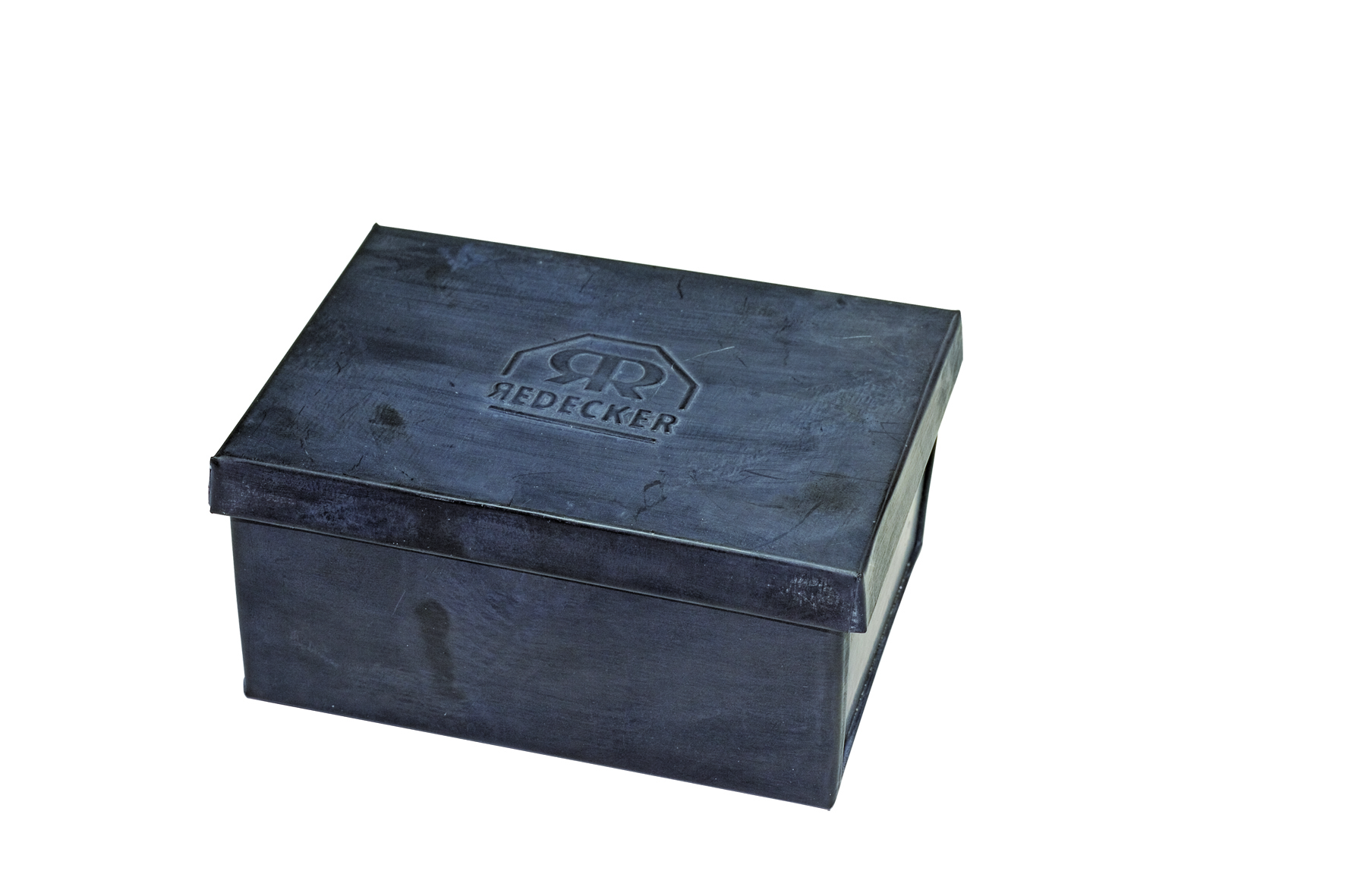 Scatola portasapone di metallo nero con coperchio. Dimensioni: 9 x 5,5 x 3 cm.