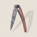 This Deejo knife is decorated with a handle plate in solid coral wood (or padauk). This species of wood has long been used in cutlery for its exquisite red/amber reflections (hence its name), robustness and excellent resistence to humidity. Here it wonderfully underscores the elegance of a Deejo knife.