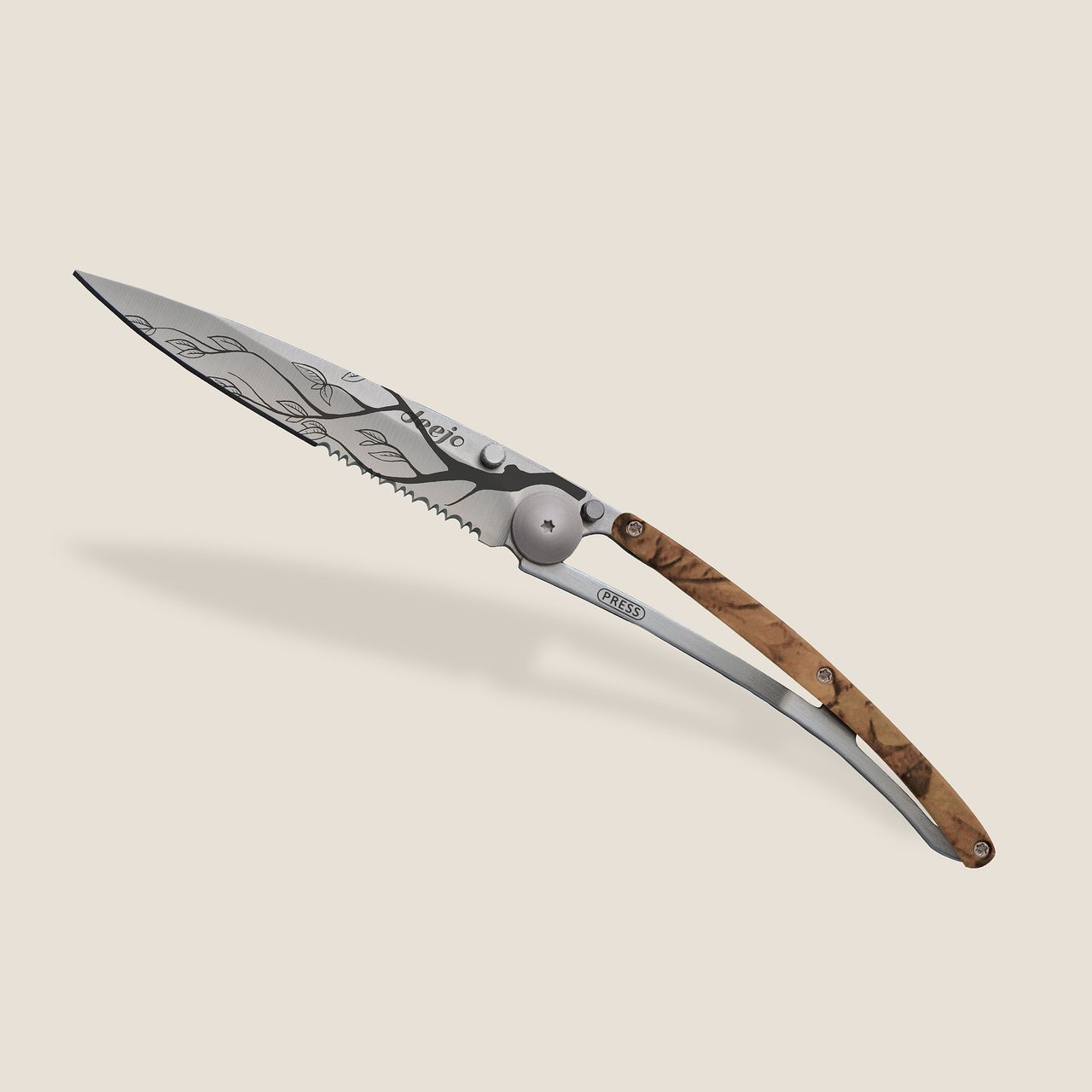 But that's not all: easy to wear, to use, to adopt, Deejo goes beyond the knife by offering the possibility of getting "tattooed": tattooing the knife, as you would mark the skin, is offering this already very personal object. a completely different dimension: his identity.