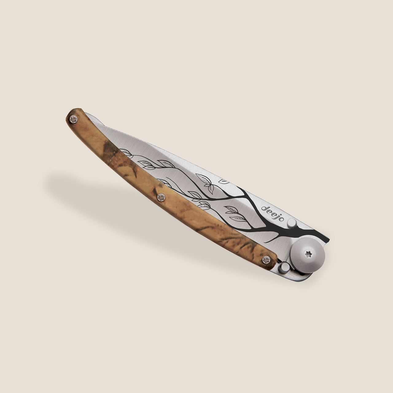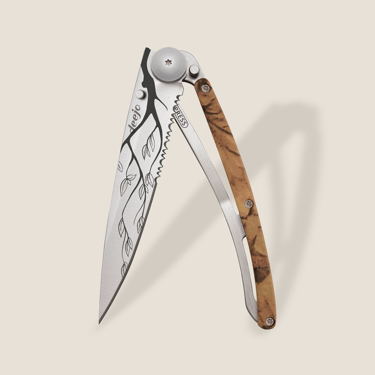 Adorning the handle of this Deejo knife is a natural scent, which gives off a lightly scented scent. All in arabic beige, each finely striped plate makes all Deejo a unique piece with a unique price.