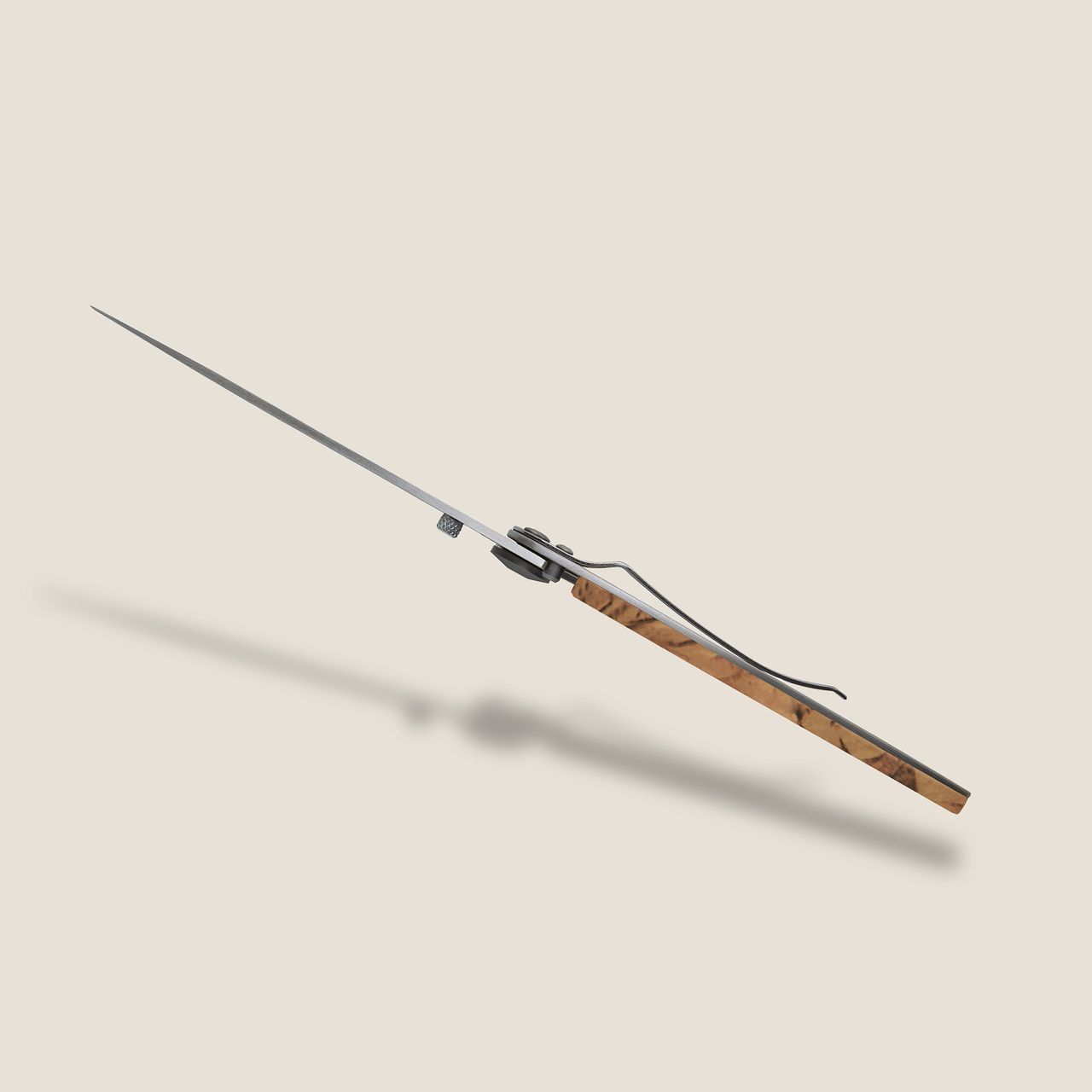 Ultralight knife in Z40C13 stainless steel, titanium gray finish. Blade with 'liner lock' type safety catch decorated with fine laser engraving. Belt clip. Juniper handle.