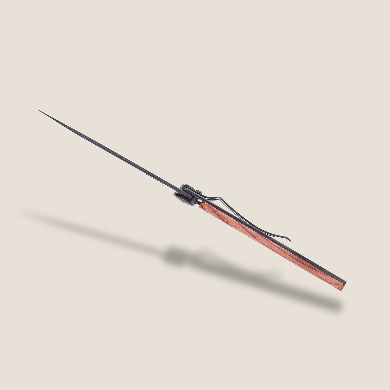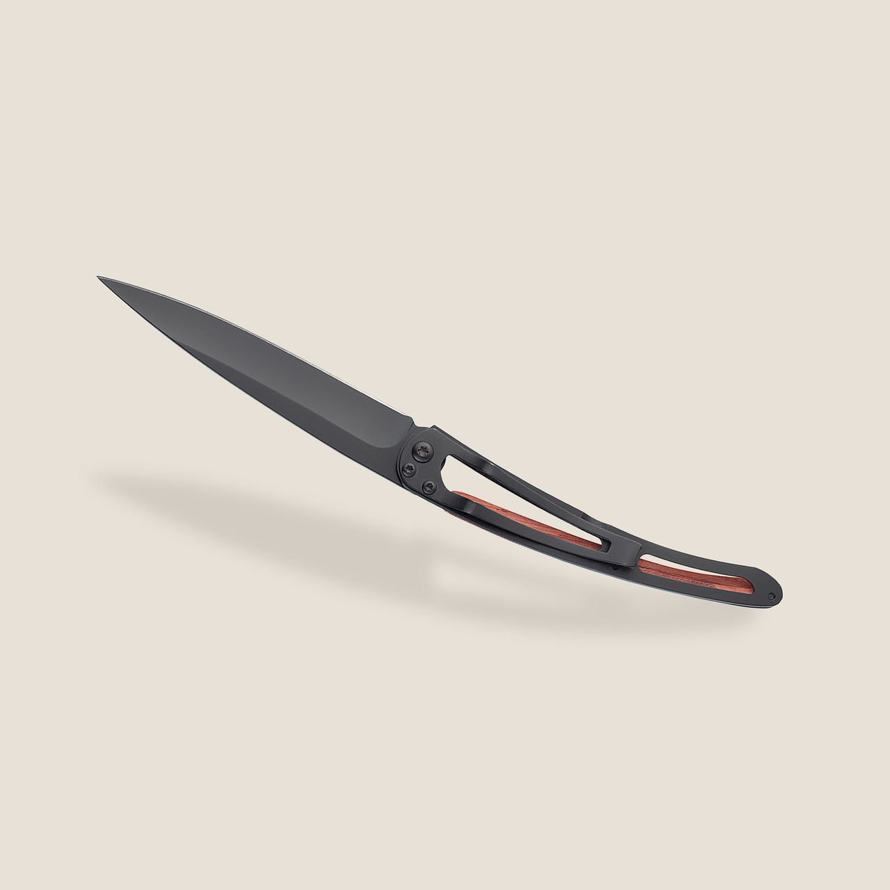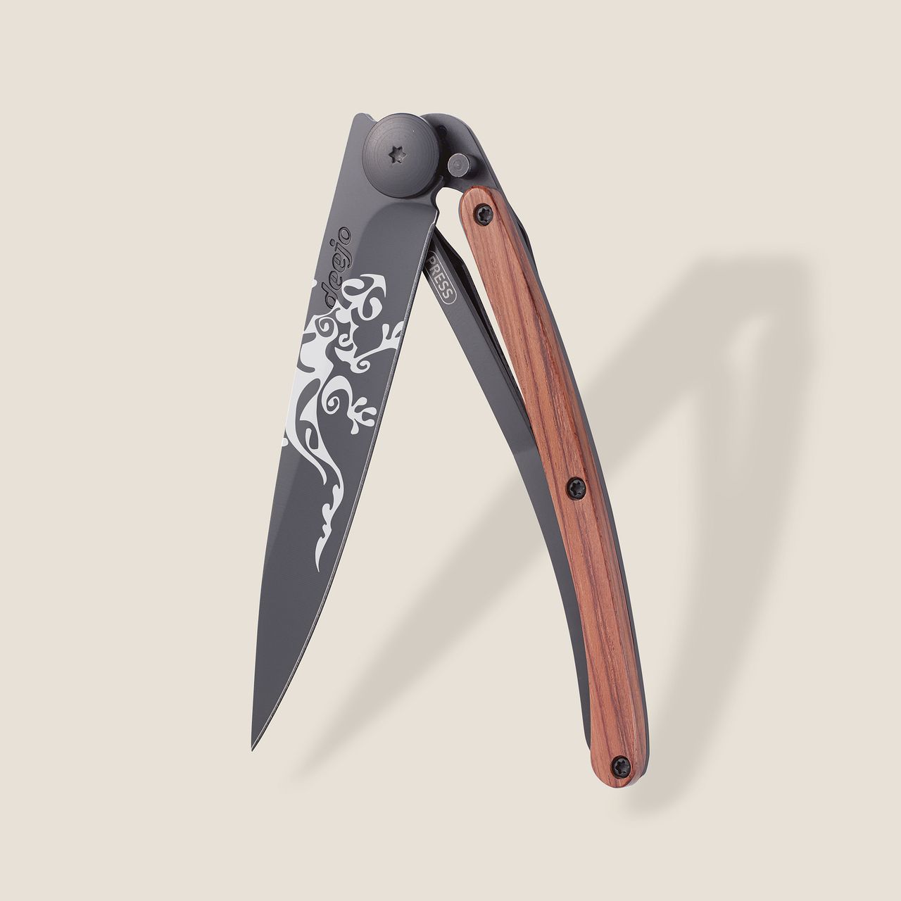 This Deejo knife is decorated with a handle plate in solid coral wood (or padauk). This species of wood has long been used in cutlery for its exquisite red/amber reflections (hence its name), robustness and excellent resistence to humidity. Here it wonderfully underscores the elegance of a Deejo knife.