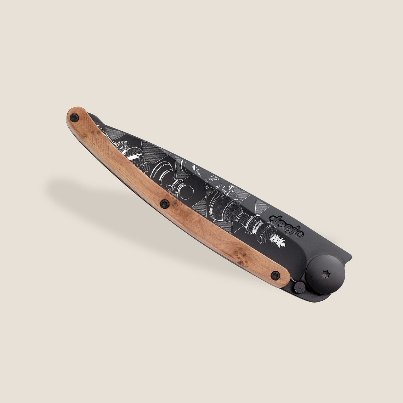 The juniper that adorns the handle of this Deejo knife is a naturally scented wood, which gives off a slightly peppery scent. All in beige arabesques, each finely striped plate makes your Deejo a unique and precious piece.