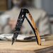 Ultralight knife in Z40C13 stainless steel, titanium black finish. Blade with 'liner lock' type safety catch decorated with fine laser engraving. Belt clip. Juniper handle.