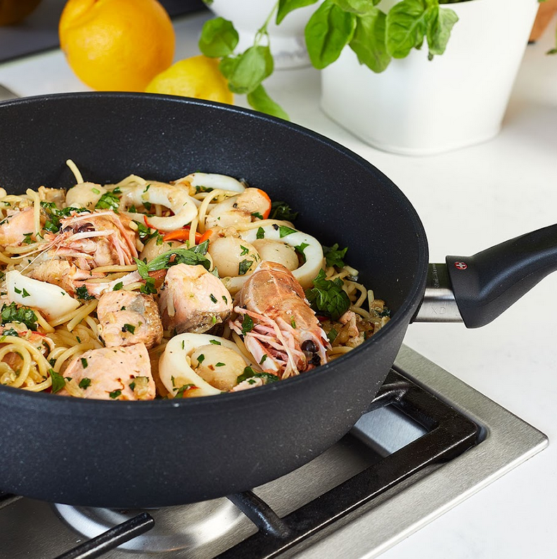 Non-stick diamond coating applied by nanotechnology, no PFOA.Swiss Made quality 100% manufactured in Switzerland. Very highthermal conductivity thanks to the fusion of thick aluminum and thediamond coating. High-pressure aluminum die-casting, non-deformablethermal base with plasma anti-corrosion treatment of the internalsurface. Resistant handles, knobs and glass in the oven up to 260°C. Lids (if any) in tempered glass, shock-resistant edge in steel andadjustable valve for steam vent.