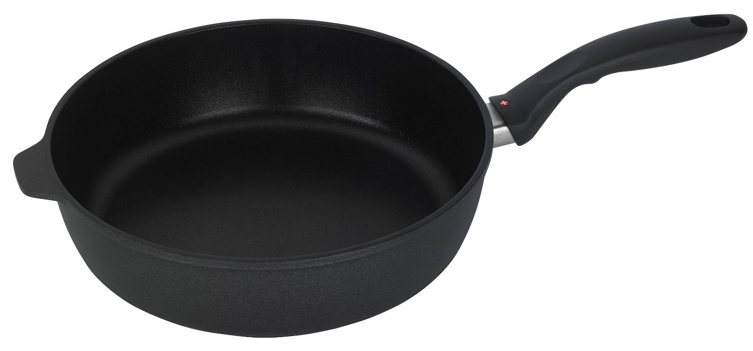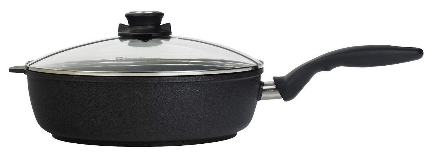 A multipurpose pot. Perfect for sautéing vegetables and for the most varied preparations. Ideal for frying. With counter lock and high edges to make the dishes jump more easily. Size 28 cm of diameter for 7.5 cm in height. Ergonomic handle and counter lock. Including tempered glass lid with adjustable steam output. Swiss Made quality, non-stick coating reinforced with diamond powder. Allows you to cook without seasoning.