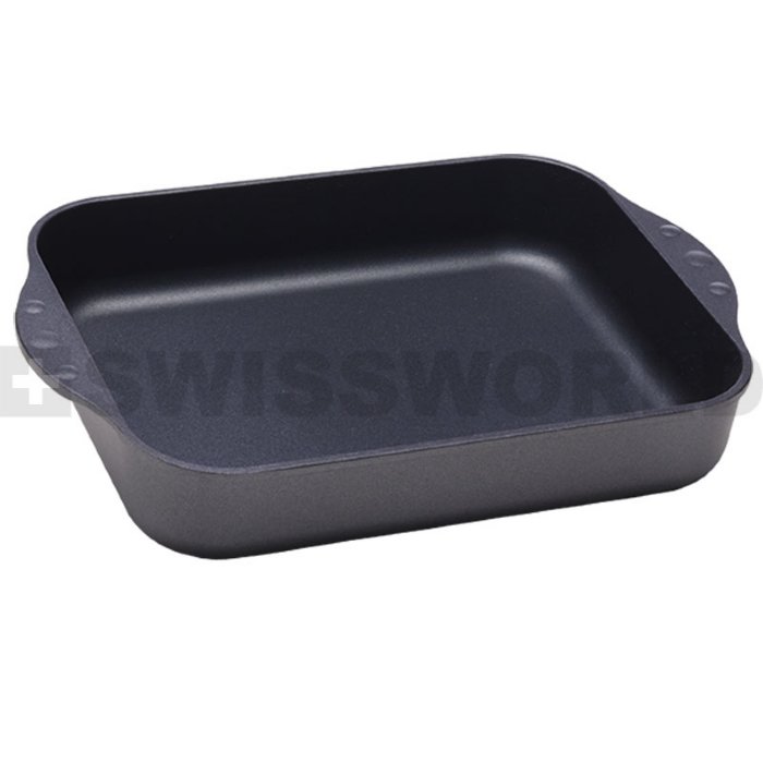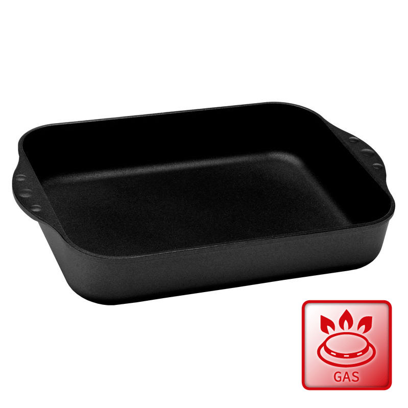 Also ideal for use on two stoves, perfect for lasagna and similar dishes. For flame and oven. Size 35x26 cm for 6.35 cm height (5.2L). Double ergonomic handle. Swiss Made quality, non-stick coating reinforced with diamond powder. Use to cook without seasonings.