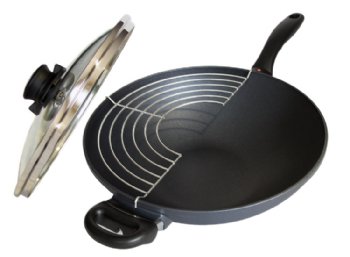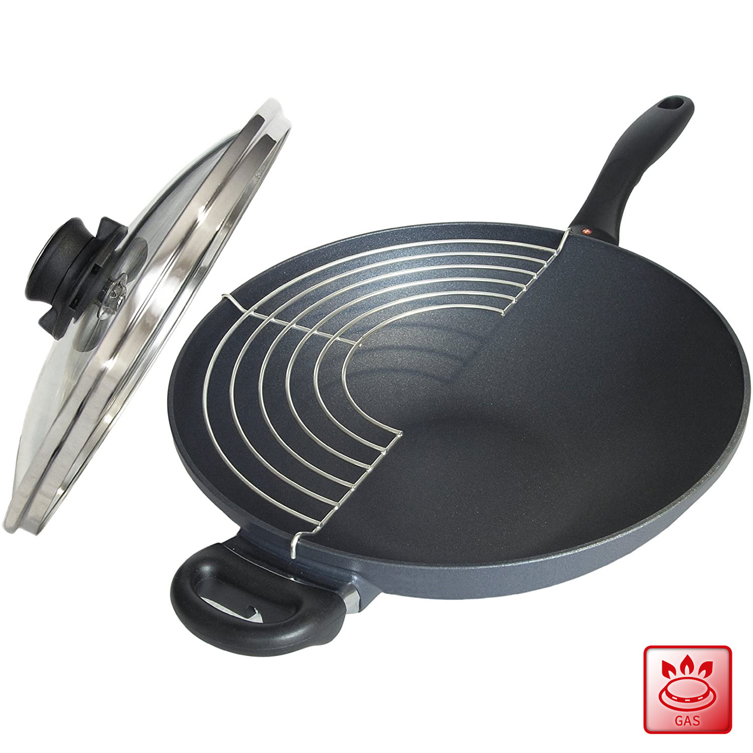 Ideal for Asian cuisine with little seasoning and for Tempura. Size 32 cm in diameter by 9.5 cm in height. Including tempered glass lid with adjustable steam outlet. Ergonomic handle and counter-handle. Swiss Made quality, non-stick coating reinforced with diamond powder (XD Version 2019). Allows you to cook without seasoning.