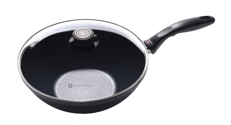Ideal for Asian cuisine with little seasoning and for Tempura. Size 30 cm in diameter by 9 cm in height. Including tempered glass lid with adjustable steam outlet. Ergonomic handle. Swiss Made quality.