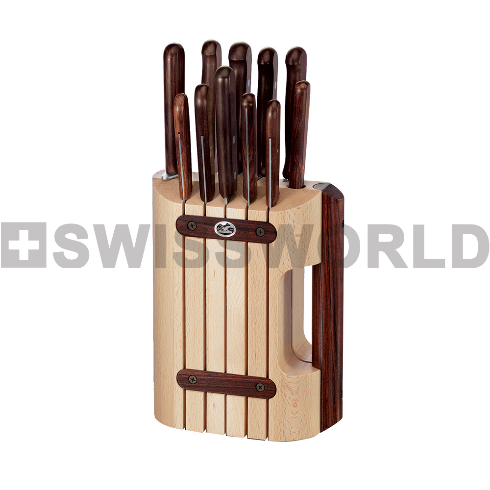 Every piece required in any kitchen is included in our 11-piece Rosewood Cutlery Block, which combines the exceptional quality expected of Victorinox blades with the timeless elegance of natural rosewood. Part of the Rosewood line, for which each handle is made of highly robust rosewood carefully hand-polished for a smooth, comfortable-to-hold surface, the eight knives come accompanied by a carving fork, a potato peeler and a sharpening steel to keep everything in efficient working order for longer. Multifunctional, natural and stylish, this block fulfills the needs of every cooking job.