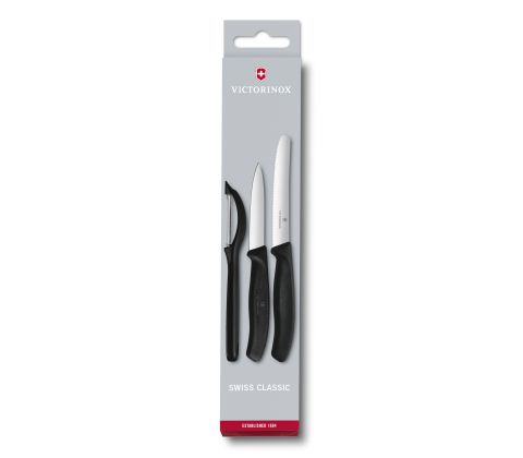 This dexterous trio will help you get ahead in the kitchen, fast. Housing two paring knives and a universal peeler, this knife set puts adept chopping, slicing and dicing versatility in the palm of your hand. The paring knives are chopping board multitaskers. Use the wavy edge for cutting through firm peel or the paring knife with straight edge and pointed tip to remove cores and seeds.