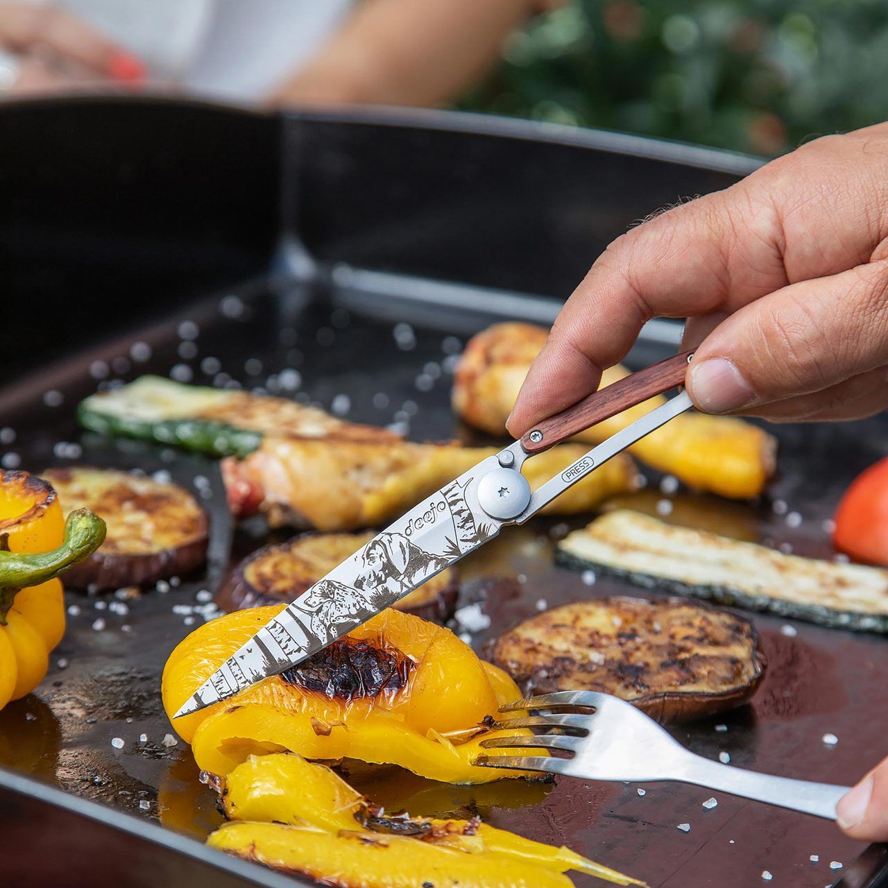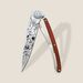 This Deejo knife is decorated with a solid coral (or Padouk) wood plate. This type of wood has long been used in cutlery for its precious red/amber reflections (hence the name), its sturdiness and excellent resistance to humidity. Here it wonderfully highlights the elegance of a Deejo knife.