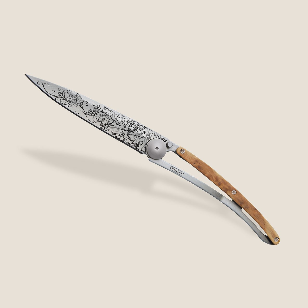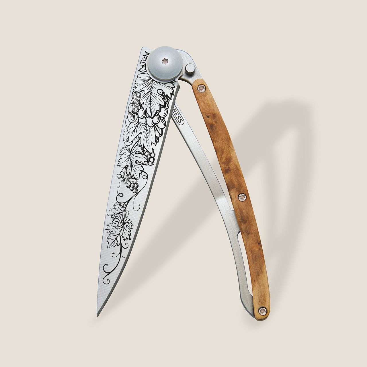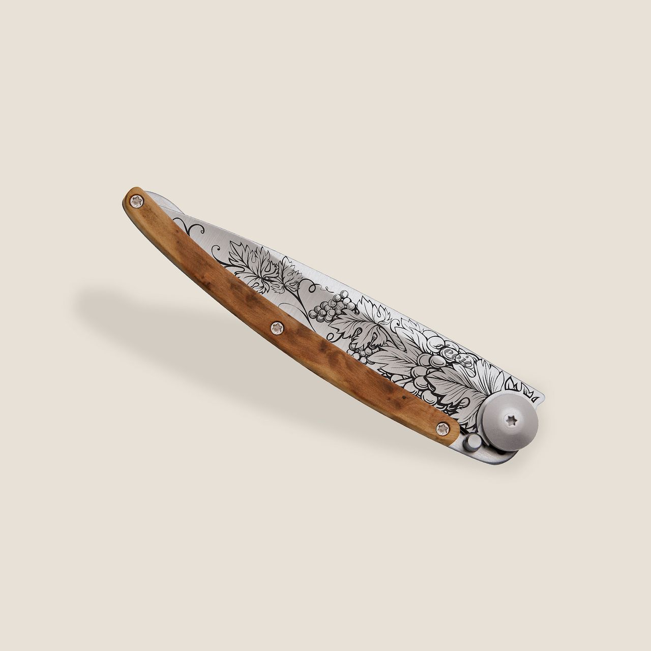 Adorning the handle of this Deejo knife is a natural scent, which gives off a lightly scented scent. All in arabic beige, each finely striped plate makes all Deejo a unique piece with a unique price.