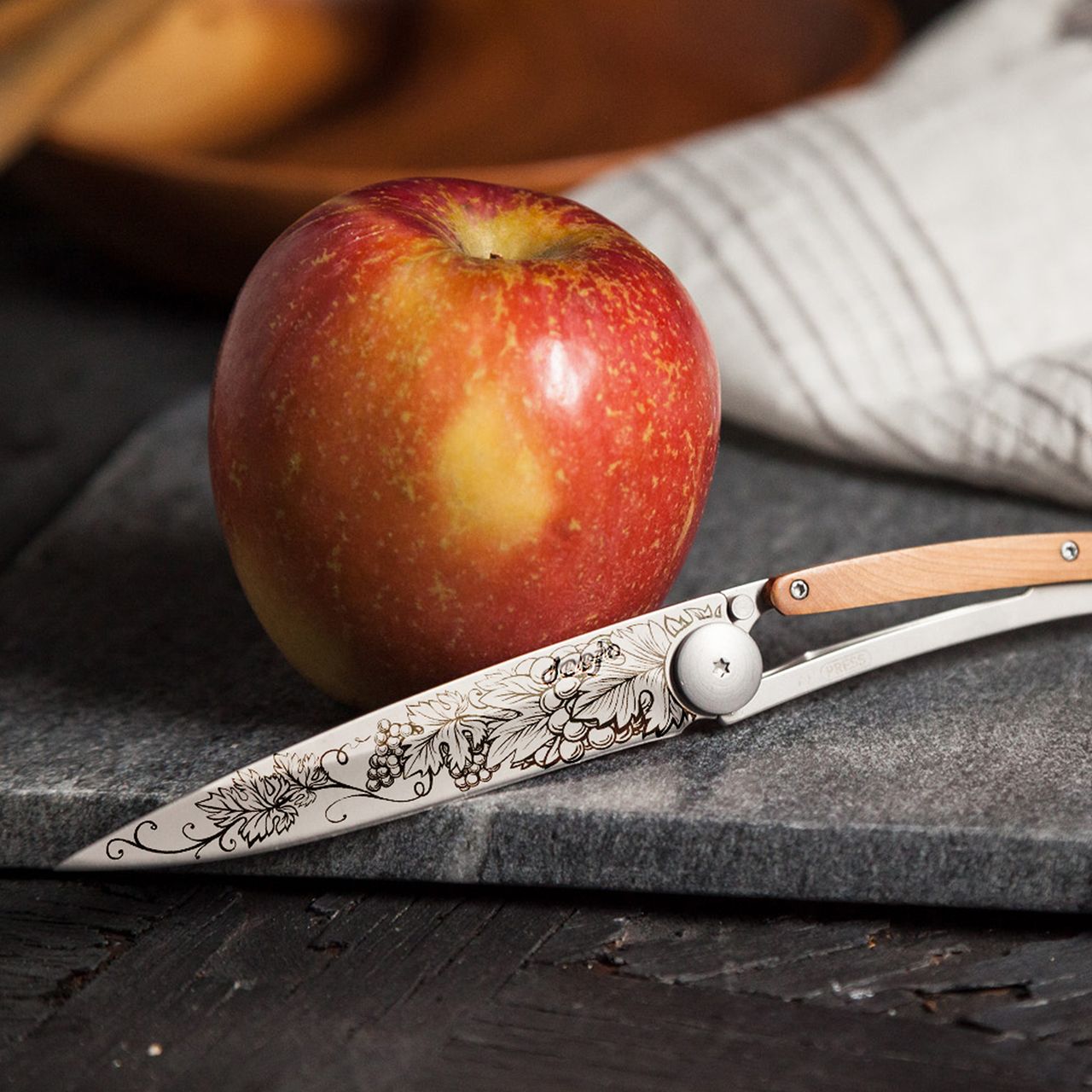 To cut meat, peel fruit or open a package, your Deejo knife cuts anywhere, anytime, but always with elegance.