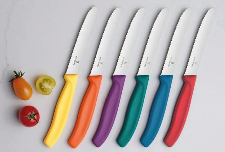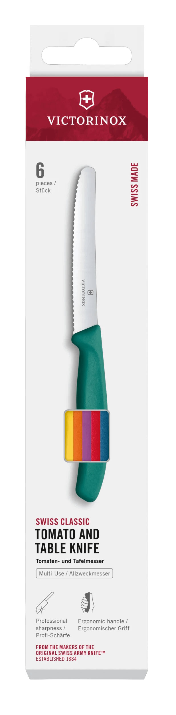 Bring color and function to the table with our tidy Swiss Classic Tomato and Table Knife. Each of the six pieces in this set of table knives has an ultra-sharp wavy edge designed for smoothly cutting through steak and pizza. And with its ergonomic handle and perfect size, you might even use it to cut everything else in the kitchen as well. Functional in purpose, but with a twist of fun in their juicy colorway of light green, blue, red, yellow, pink and orange, this set lifts the mood in any kitchen and at any table.