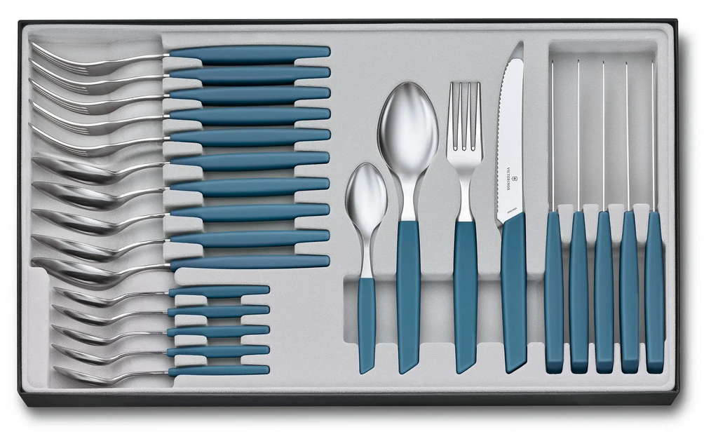 - Timeless set with 24 pieces and modern-shaped synthetic handles