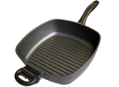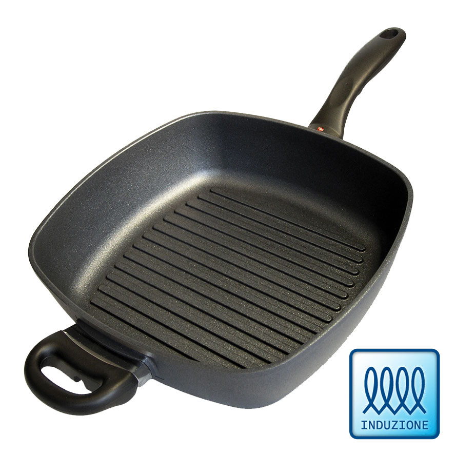 Dimensioni cm 28 di lato per cm 7,5 di altezza. Manico ergonomico e contromaniglia. Ha i bordi alti per evitare schizzi, le nervature profonde tengono il cibo separato dal grasso per una cottura più sana. Rivestimento antiaderente rinforzato con polvere di diamante (Versione XD 2019). Consente di cucinare senza condimenti. Qualità Swiss Made.