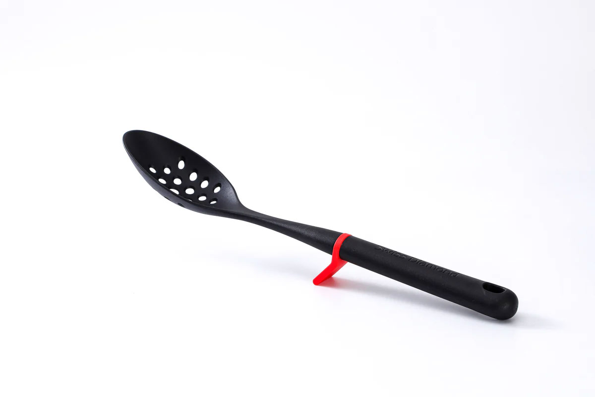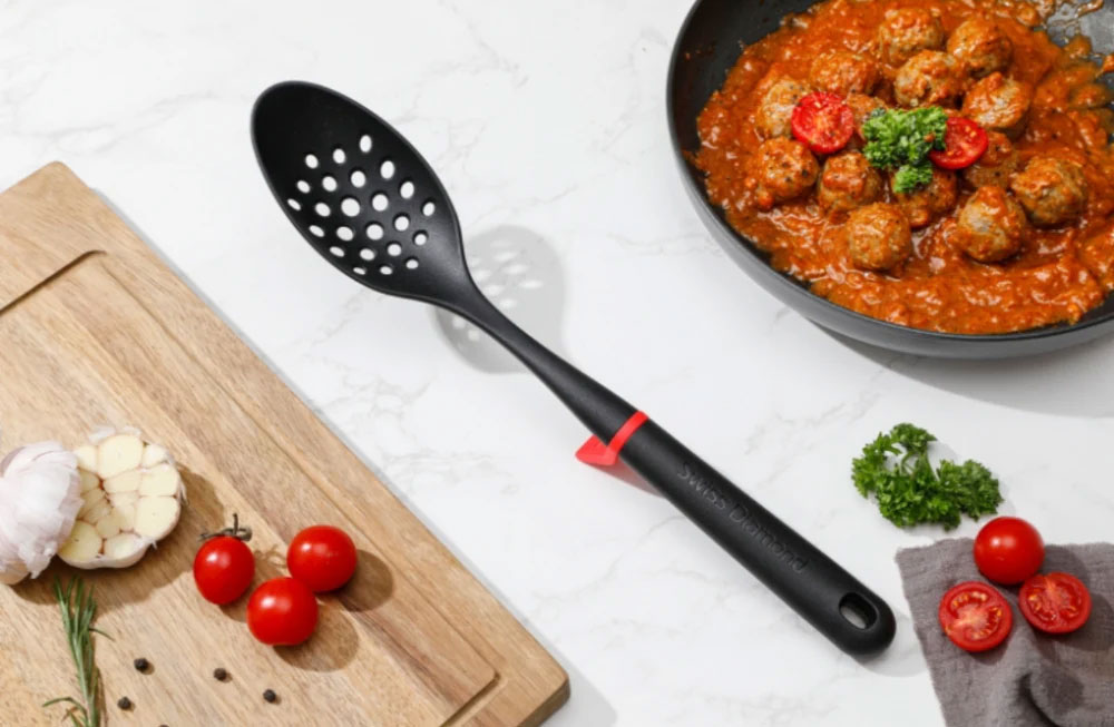 La collezione di utensili Swiss Diamond LiftGrip migliora l'efficienza in cucina grazie al suo design a doppia funzione e al supporto integrato che mantiene le teste degli utensili sollevate dal piano di lavoro, garantendo una superficie pulita e riducendo la contaminazione. L'impugnatura ergonomica offre comfort e controllo per cucinare, mescolare e servire con facilità. Compatibile con tutte le pentole, comprese le friggitrici ad aria!