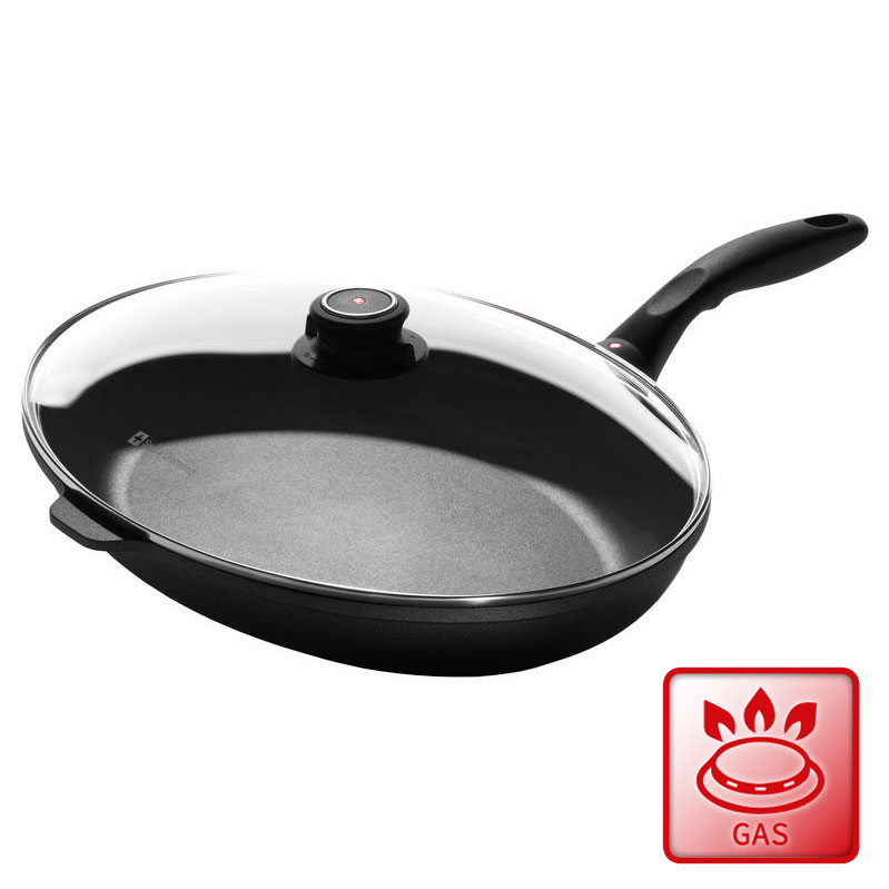 Forma ideale per cucinare il pesce. Il fondo più alto garantisce una distribuzione uniforme del calore partendo dal centro. Dimensioni cm 26 x 38 per cm 5,5 di altezza. Manico ergonomico e contromaniglia. Qualità Swiss Made, rivestimento antiaderente rinforzato con polvere di diamante. Consente di cucinare senza condimenti. Compreso coperchio in vetro originale Swiss Diamond con manopola di regolazione del vapore.