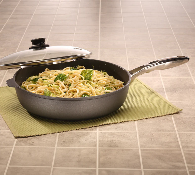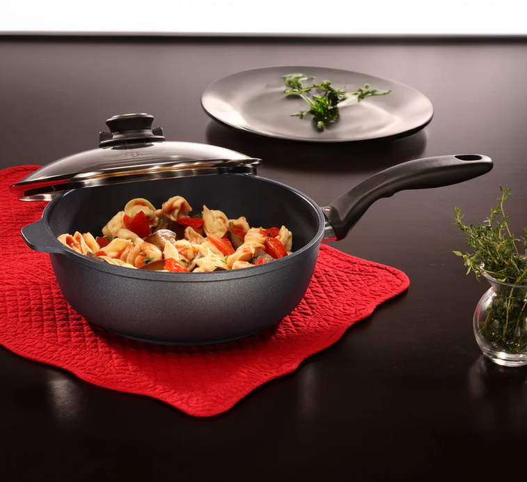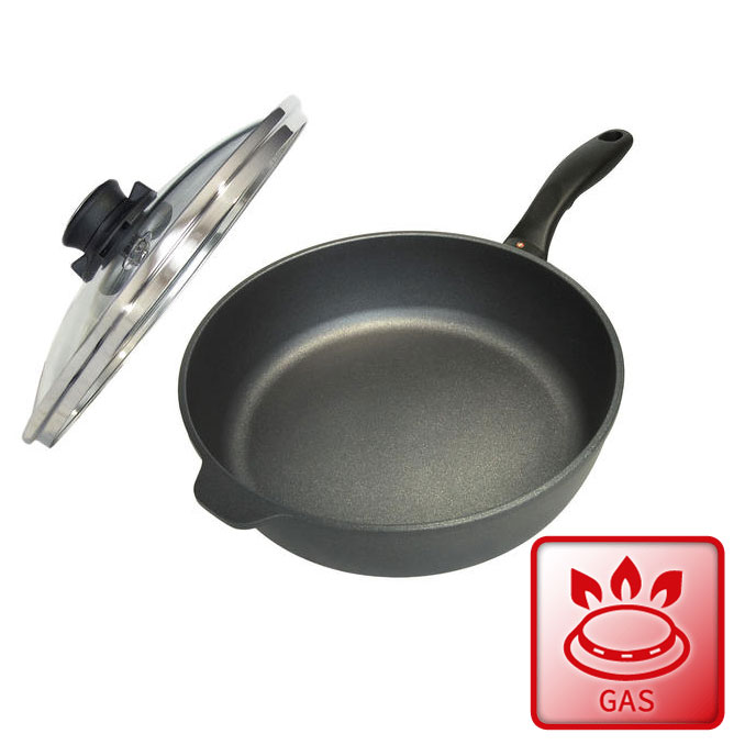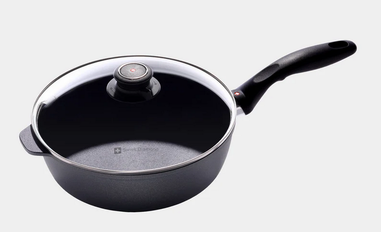 Una pentola polivalente. Perfetta per spadellare verdure e per le preparazioni più varie. Ideale per fritture. Con contromaniglia e bordi alti per far saltare più facilmente le pietanze. Dimensioni cm 24 di diamentro per cm 7,5 di altezza. Manico ergonomico e contromaniglia. Compreso coperchio in vetro temperato con uscita del vapore regolabile. Qualità Swiss Made, rivestimento antiaderente rinforzato con polvere di diamante. Consente di cucinare senza condimenti.