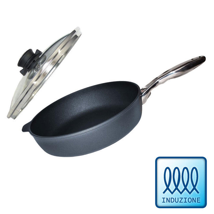Una pentola polivalente. Perfetta per spadellare verdure e per le preparazioni più varie. Ideale per fritture. Con contromaniglia e bordi alti per far saltare più facilmente le pietanze. Dimensioni cm 32 di diamentro per cm 7,5 di altezza. Manico ergonomico e contromaniglia. Compreso coperchio in vetro temperato con uscita del vapore regolabile. Qualità Swiss Made.
