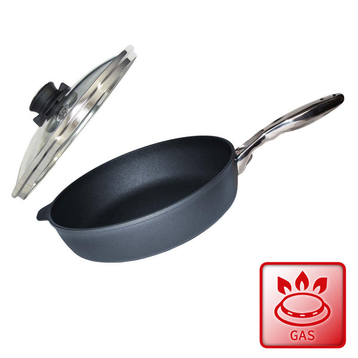 Una pentola polivalente. Perfetta per spadellare verdure e per le preparazioni più varie. Ideale per fritture. Con contromaniglia e bordi alti per far saltare più facilmente le pietanze. Dimensioni cm 32 di diamentro per cm 7,5 di altezza. Manico ergonomico e contromaniglia. Compreso coperchio in vetro temperato con uscita del vapore regolabile. Qualità Swiss Made, rivestimento antiaderente rinforzato con polvere di diamante. Consente di cucinare senza condimenti.
