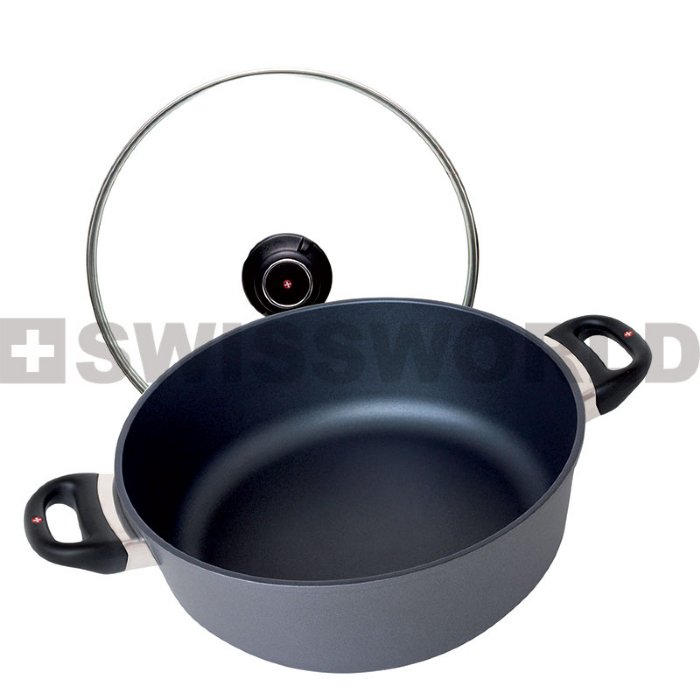 Ideale per zuppe. Compreso coperchio in vetro temperato con uscita del vapore regolabile . Dimensioni cm 32 di diametro per cm 11 di altezza. Doppio manico ergonomico. Qualità Swiss Made, rivestimento antiaderente rinforzato con polvere di diamante. Consente di cucinare senza condimenti.