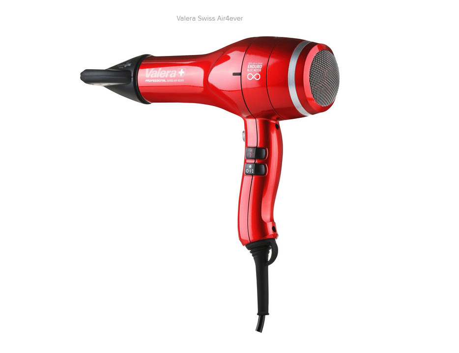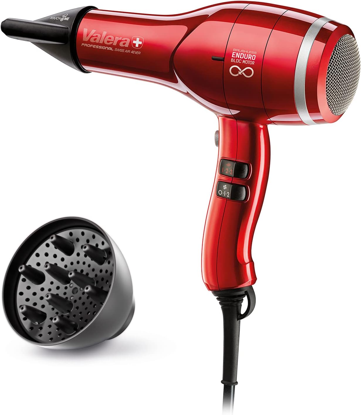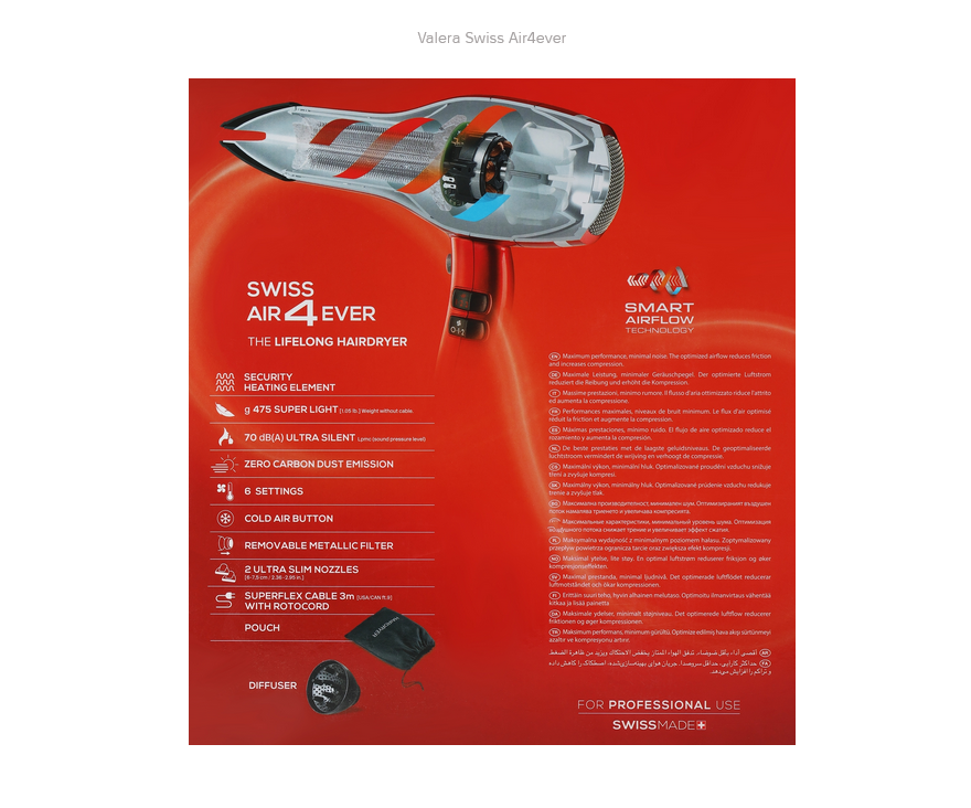 L'asciugacapelli Valera Swiss Air4ever è dotato di un esclusivo motore brushless ENDURO BLDC a controllo elettronico e la tecnologia brevettata Smart Airflow, protegge in modo affidabile i capelli dalla secchezza e dai danni. Comprende 6 combinazioni di temperatura/flusso dell‘aria e 2 bocchette professionali ultra strette: bocchetta TOUCH ME (7,5 cm), bocchetta standard (6 cm) quindi è adatto per qualsiasi tipo di capelli e styling.