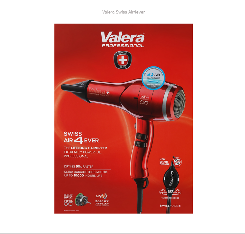 Per avere sempre capelli sani, lucenti e attraenti devi solo scegliere un asciugacapelli di alta qualità, e questo è già presentato dal marchio Valera. La serie di dispositivi Swiss Air4ever è più silenziosa del 30-50% rispetto alle altre, il che la rende un ottimo acquisto per gli stilisti che lavorano nei grandi saloni.