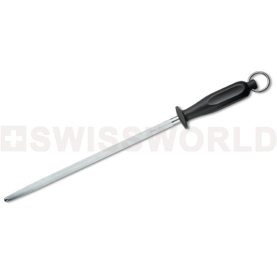 Acciaino da Macellaio Tondo. Lunghezza totale: 30cm. Manico Nero Antiscivolo e Anello in Acciaio. Ideale per rinnovare il filo dei vostri coltelli più utilizzati. Adatto sia per uso domestico che per un intenso utilizzo a livello professionale.