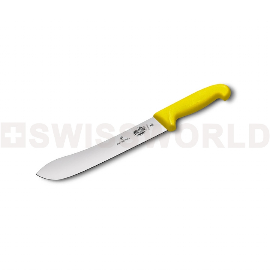 Coltello da Macello Professionale Scimitarra a punta Larga. Per AFFETTARE o da SCELTA. Manico in fibrox Giallo antiscivolo. Lunghezza Lama: 25cm.