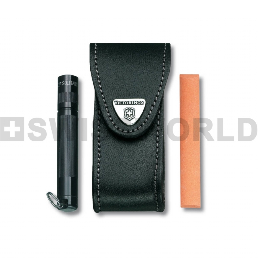 Custodia in pelle nera per multiuso 84-91-93mm con chiusura in velcro e passante per cintura. Misure interne in mm (altezza x larghezza x spessore): 94 x 24 x 20. Stemma metallico Victorinox. Prodotto Originale Victorinox. Dotata di tasche laterali in pelle per torcetta (tipo MiniMagLite) e pietra per affilatura (NON comprese nella confezione).