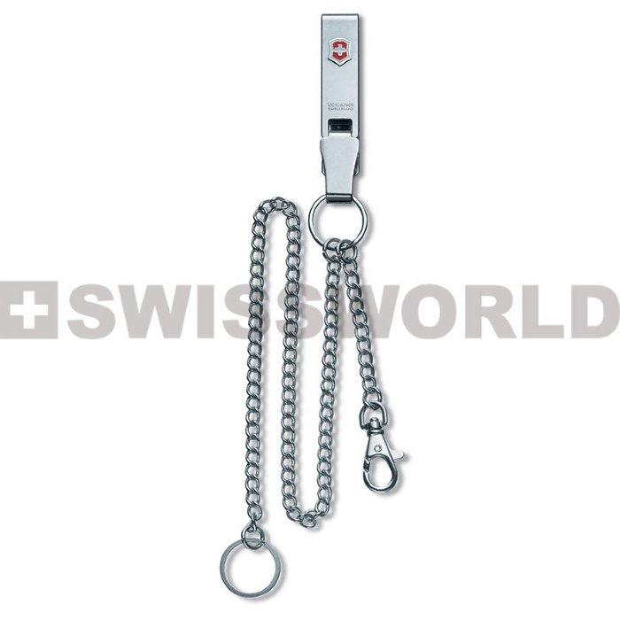 Gancio Multiclip con doppia catenella.Catenella lunga con anello per attaccare le chiavi che si appoggiano al fondo della tasca e catenella corta con moschettone per multiuso. Fornito in scatoletta. Accessorio originale Victorinox.