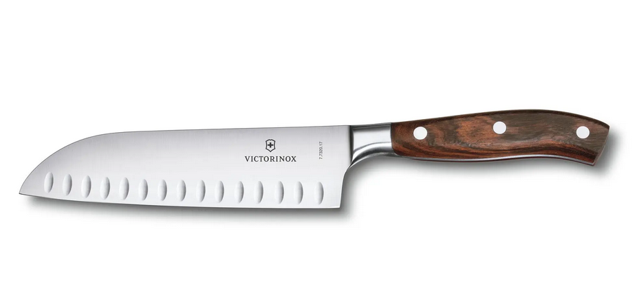 Il coltello Santoku Grand Maître unisce una forma meravigliosa a un’elevata funzionalità. Proviene dalla serie di coltelli forgiati Victorinox e ha una lama a codolo intero temprata in modo uniforme e perfettamente bilanciata. Ma non è solo la lama a dare a questo coltello Santoku la sua robustezza: anche il manico in legno dà il suo apporto nella stessa direzione, grazie alle sue caratteristiche di eleganza e resistenza. Levigato a mano e dotato di un design ergonomico, questo manico promette a chi lo impugna comodità e il massimo della facilità d’uso, per tutto il tempo che sarà necessario. È un raffinato tuttofare, progettato per tagliare con precisione qualsiasi cosa, dalla carne al pesce, dalla frutta e verdura al formaggio. La sua lama alveolata riduce al minimo la possibilità che gli alimenti restino attaccati alla lama. Per l’uso sia in cucine domestiche che in contesti professionali.