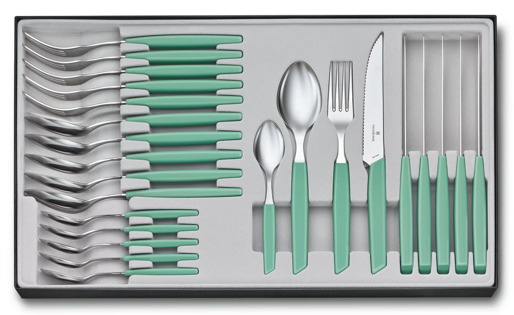 Crea un look elegante e moderno con questo impeccabile set di posate. Perfettamente equilibrato ed elegante con naturalezza, ogni pezzo è realizzato in acciaio inossidabile leggero ma resistente con lame affilatissime e impugnature piacevolmente confortevoli. Con una scelta di colori eleganti per le impugnature, il set da tavola Swiss Modern da 24 pezzi porterà classe e praticità sulla tua tavola.